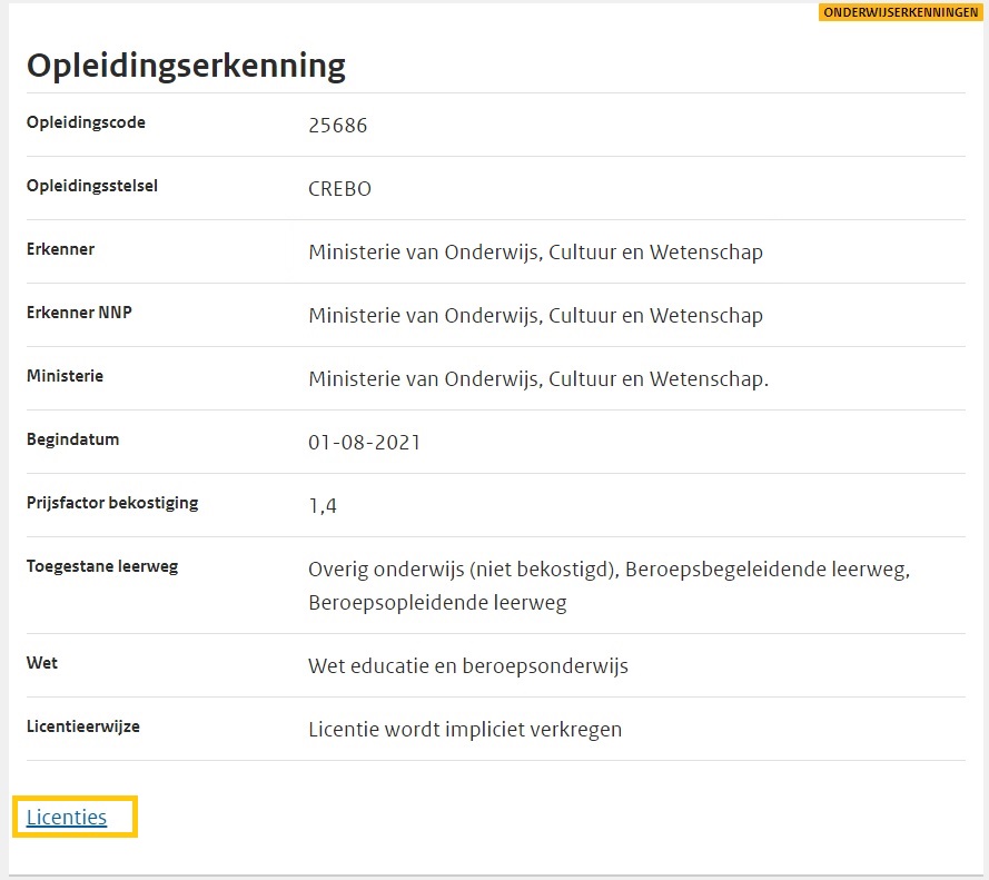 - Klik op 'Licenties' om te zien welke onderwijsinstellingen een licentie hebben om de opleiding te mogen geven. In de mbo-sector mogen alle instellingen zelf kiezen welke erkende mbo-opleiding ze aanbieden.